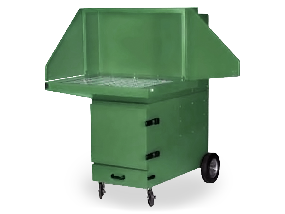 Downdraft tables for work cells have all of the capabilities of their full-sized cousins. Typically, the smaller downdraft tables operate on 115V single phase electricity (with 3 phase motors available) and can be easily moved from one location to another. Work cell downdraft tables are compact air filtration solutions designed to maximize safety and collection efficiency while minimizing shop floor space. The thoughtful design of the work cell downdraft units provides portability while maintaining protection from harmful particulate and fumes. Depending on the unit the portable work cell downdraft styles presented below are available with two different types of filtration: 1) self-cleaning cartridge filters and 2) replaceable panel filters.